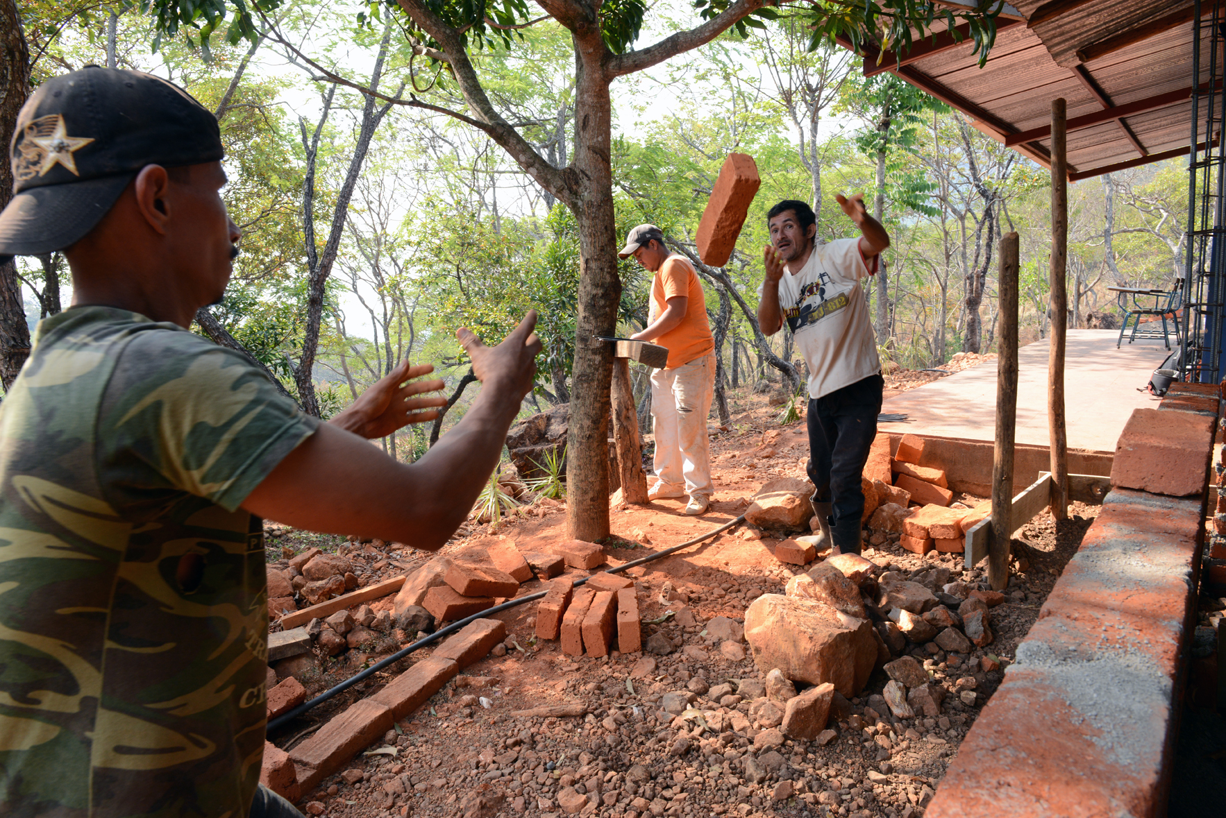 That’s tough work, especially in the 98° heat of the Sun for most the day. We had about 6 people working at all times; Sergio and Panchin are paid masons. They make sure we do it right. Sergio is the guy here in orange. Alcir and Javier are making a line for the bricks, and I’m then tossing them gently in the barrel of water.