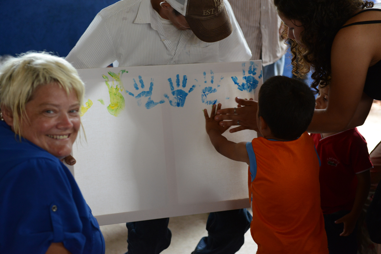 We also had a 16x20 canvas art board. We brought all the preschoolers together and Marisela and I painted their hands and pressed their tiny prints onto it, followed by us, in yellow, green, blue and red, to make our own fine art that will hang on the wall ...