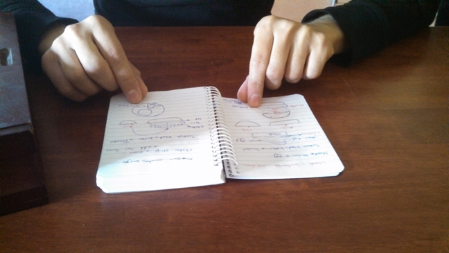 He is taking notes as he's training as the chef: little notes and doodles on how the plates are arranged and what goes on them.