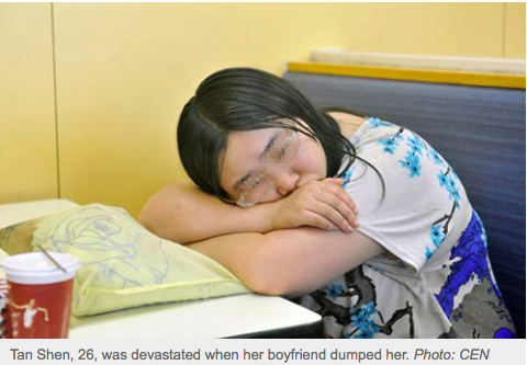 Tan Shen, 26, said that she was walking around depressed after being dropped by her lover and went into a branch of the fast food outlet in a train station in Chengdu, China.