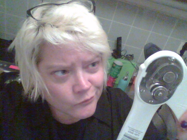I look again. Directions, on the flip side, in English. Hold the thing: rotate clockwise. Wrong way. OK.