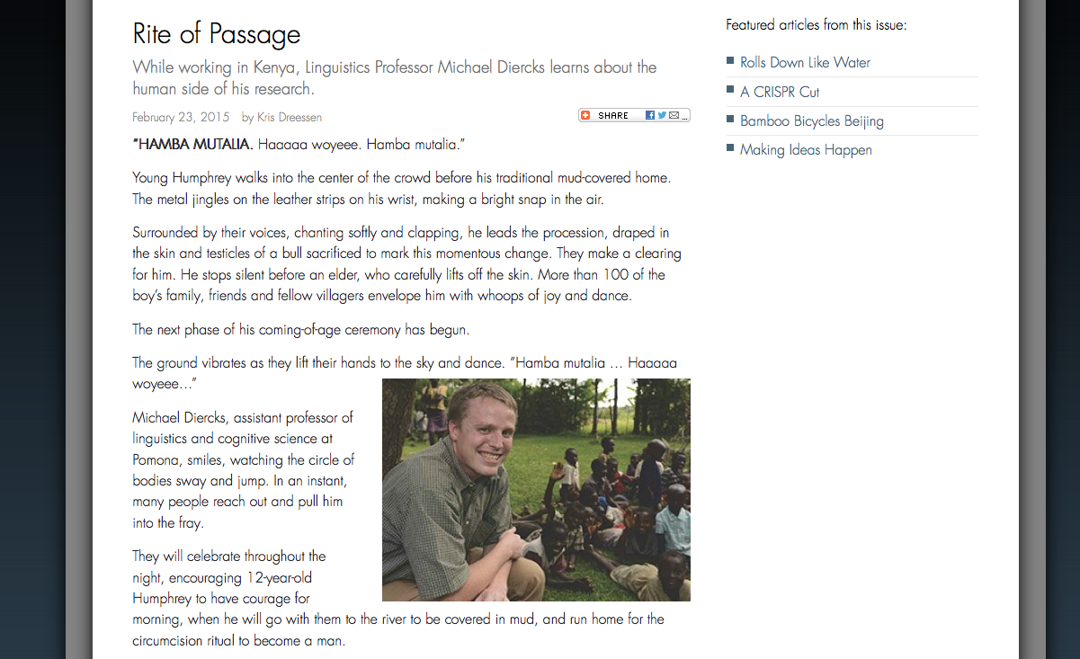 Here is the article for Pomona College alumni magazine, which includes the Bukusu circumcision.