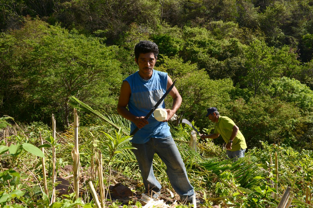 Jean Pierre slips the harness around the thick trunk of the palm and ties it tight. It is made out of fronds itself, tightly wound into rope and dried. Leaning back like a lineman working on an electric cable, he grips it and lifts his left bare f…